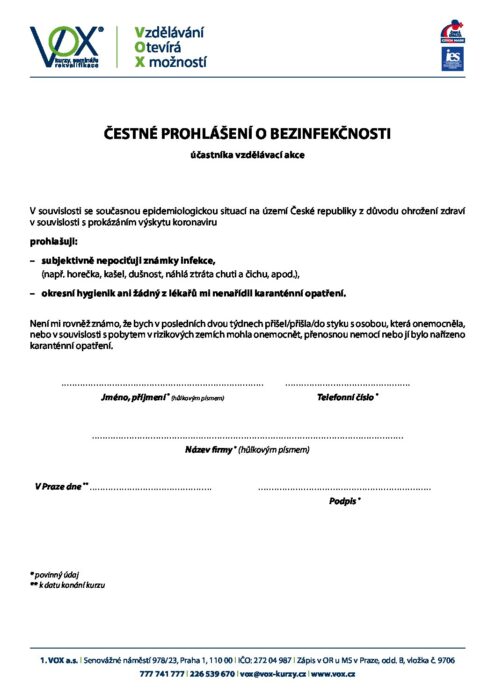 Tištěná přihláška: Je možné zaslat poštou, případně předat osobně v kanceláři VOX před začátkem semináře (podrobnosti zde).